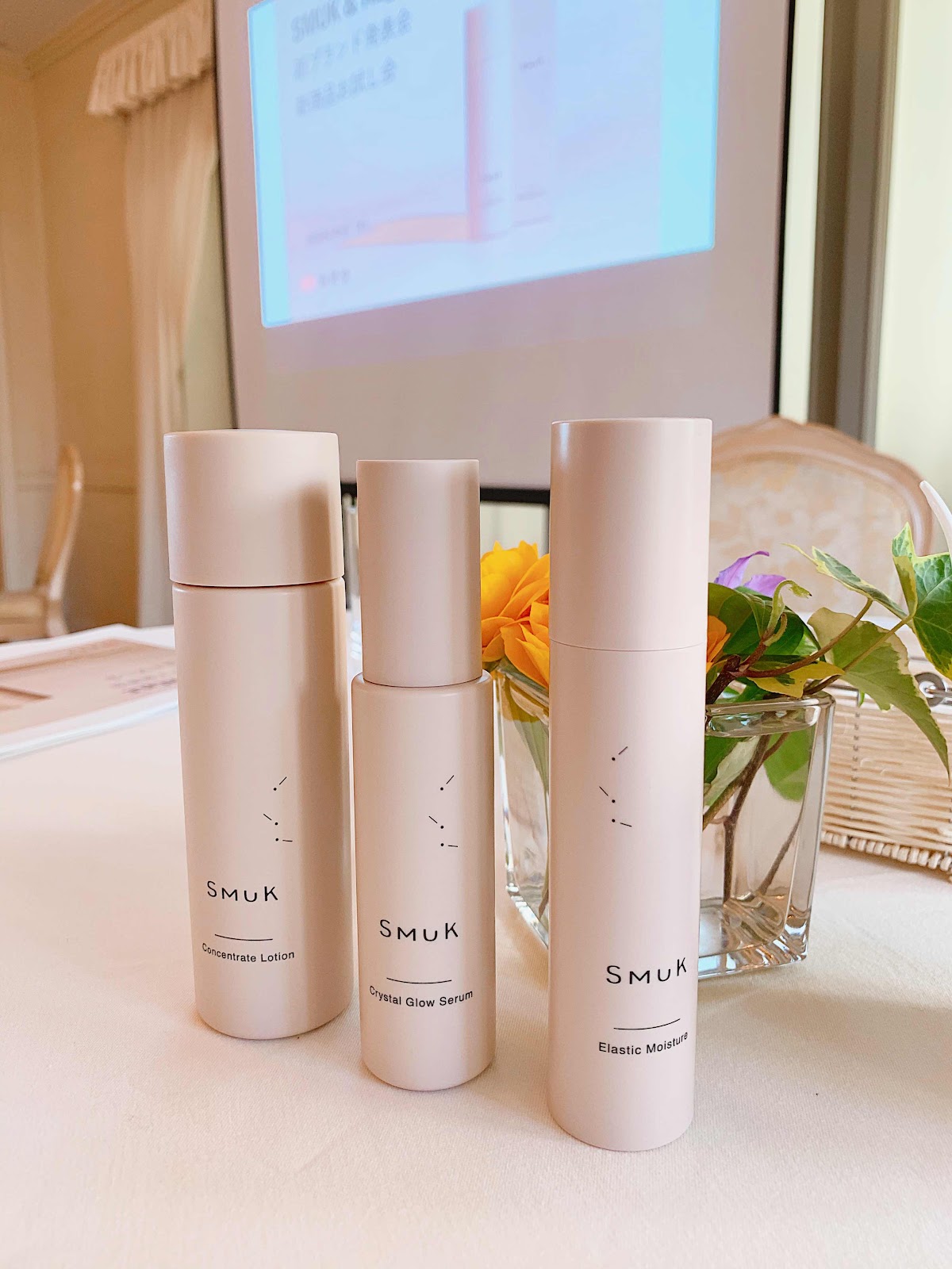 先ずは「SMUK(スムーク)」。デンマーク語で「美しい」を意味するブランド名です。健康な素肌を思わせるライトベージュのボトル。洗練された無駄のない形がまさに"SMUK"、思わず手に取ってみたくなりました。